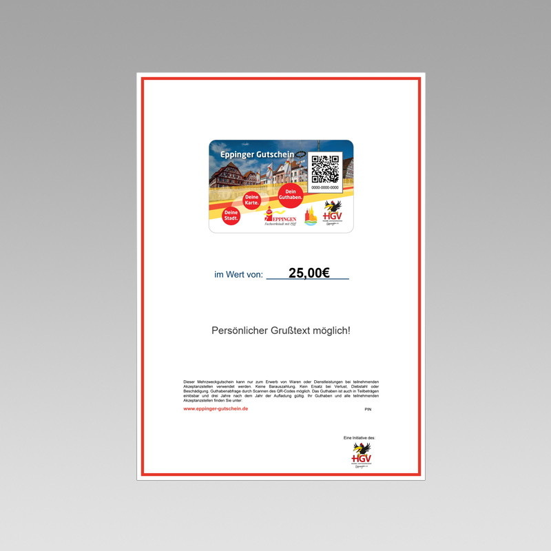 Mit dem Kauf unterstützen Sie Ihre Lieblingsläden in Eppingen und helfen dabei, unsere schöne Stadt so zu bewahren, wie wir sie kennen. Der PDF-Gutschein kann mit einem Wunschbetrag zwischen 10 und 150 € aufgeladen werden und bei allen teilnehmenden Geschäften auch in Teilbeträgen eingelöst werden.